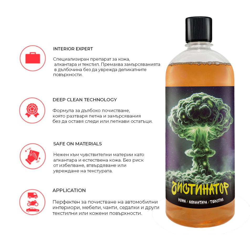 Въпреки, че Чистинатор е специализиран за почистване върху кожа, алкантара и текстил може да бъде използван върху всякакви повърхности намърсени с мазни и органични замърсявания.